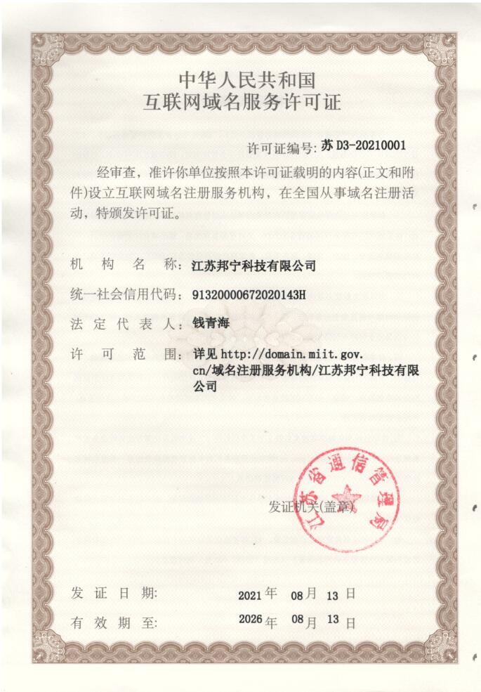 域名注册服务机构批复 苏 D3-20210001